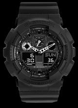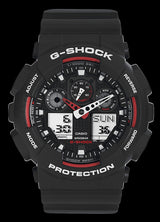 Introducing a collection of new G-SHOCK models whose 35mm diameter faces and large cases give them a look of power and strength. Dial rings and raised hour markers also create three-dimensional depth that gives the face plenty of character. These watches are designed and engineered to deliver outstanding shock resistance, are 200m water resistant, and anti-magnetic. The GA-100-1A4ER is beautifully finished in black with red accents and a black resin strap for a distinctive look.Over-sized buttons come with a checkered anti-slip surface to make operations fast and sure.1/1000-second stopwatch, velocity indicator, World Time, 5 alarms and much more provides these models with unmatched function and performance.