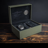 The dial is deftly split into outer and inner dials divided by the finest metallic border, framing a textured inner dial with subtle wavy texture, created from the NATO symbol for amphibious assault.