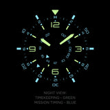 View the watch at night or in poor visibility and everything changes. High grade Superluminova glows blue for mission timing and green for normal time checks. Simple, functional, elegant.