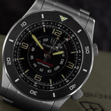 Imagine you’re nine hours out from mission start, simply rotate the split scale inner bezel and set it nine hours in advance of the GMT hand. The GMT hand will count around the bezel scale to H hour, mission start, then automatically begin it’s journey around the second half of the split inner bezel, counting up to a rendezvous say 11 hours after H hour, mission start.