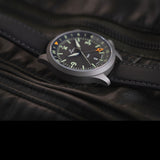 The caliber Laco 330, a mechanical movement with automatic winding mechanism is a guarantee for precision. It is based on the tried and trusted Swiss made caliber Sellita 330-2, ticking behind a solid steel case back decorated with an aircraft relief. The Frankfurt GMT has a black leather strap and is supplied in a modern aluminium gift box with a "Remove before flight" keyring. The box also includes a two-tone nylon band and a strap changing tool.