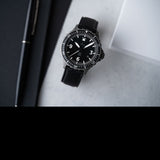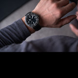 - STRAP: Black, water-resistant Nytech strap, dark sandblasted stainless steel buckle, screwed bars