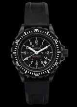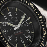 The Diver’s Automatic uses self contained Tritium gas tubes to ensure constant visibility in low light situations. A gas tube is placed on each hour marker, each hand and uses MaraGlo for the 12 hour bezel marker. Tritium tubes are self illuminating gas tubes which contain an isotope of hydrogen, meaning they will not dull down in brightness like normal photo-luminescent paint which requires an external light source to create a glow.