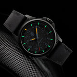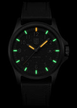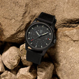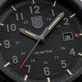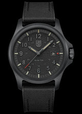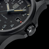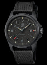 The Luminox Atacama Field 1961 watch is inspired by its namesake, the Atacama Desert. The full blackout design with textured finish dials evokes the terrain and rugged landscape of the desert. The timepiece presents a large dial that displays the 12- & 24-hour clock, along with a red tipped second hand and red arrow next to the date at 3 o’clock for instant readability. The dial is protected by sapphire crystal with anti-reflective coating.