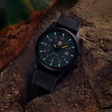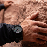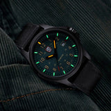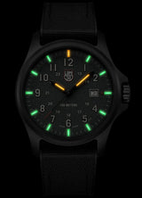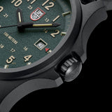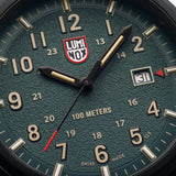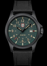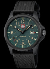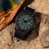 The Luminox Atacama Field 1977 watch is inspired by its namesake, the Atacama Desert. The design with a dark green dial with textured finish and sand hour numbers evokes the terrain and rugged landscape of the desert. The timepiece presents a large dial that displays the 12- & 24-hour clock, along with a red tipped second hand and red arrow next to the date at 3 o’clock for instant readability. The dial is protected by sapphire crystal with anti-reflective coating.